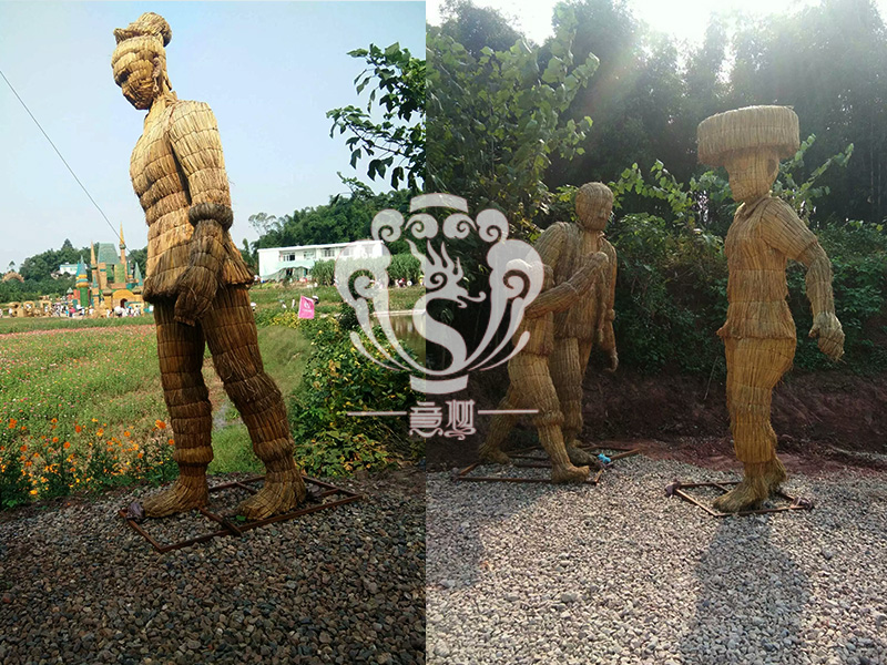 現(xiàn)在的精致稻草人藝術(shù)通常是由專業(yè)美術(shù)老師的造型放樣,然后由焊工師傅焊接出立體造型造型,然后以稻草或者稻草繩為材料編捆制作而成。